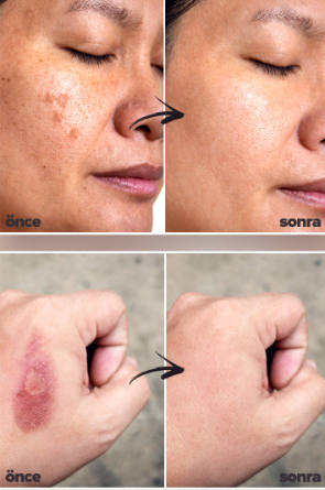 - Güneş yanıkları , yaşlılık lekeleri,doğum lekeleri, çil lekeleri ,benek lekeleri, kararmaları sivilce izleri, yanıkları , yara izlerini , siğilleri ve inatçı lekeleri yok eder.